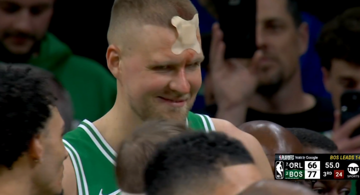 波尔津吉斯进行简单的止血处理,贴着超大号的创可贴回到场上,现场球迷为他欢呼,波津头顶都是血迹,坚持罚球后再次返回更衣室,进一步接受治疗。
